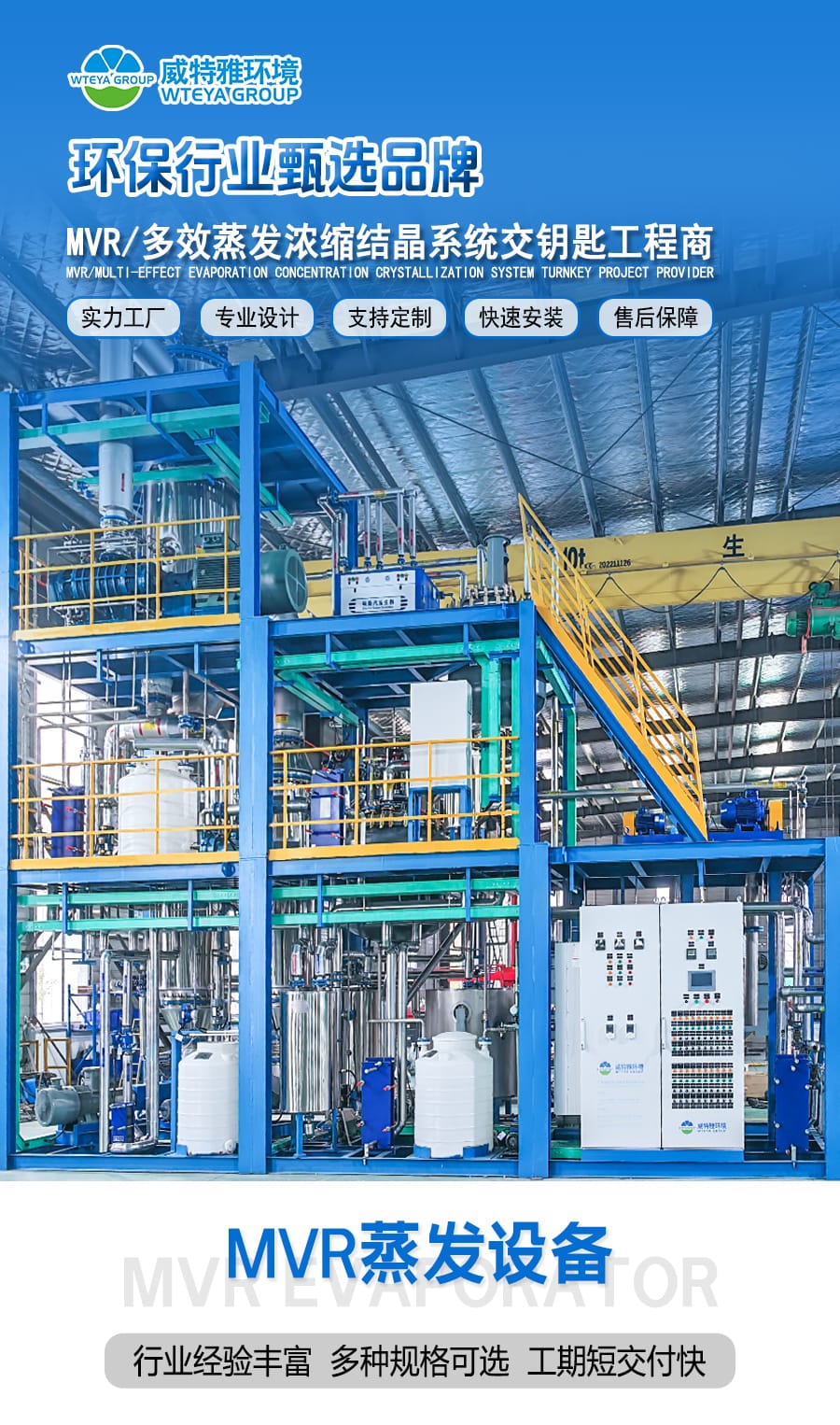 威特雅致力于客户实现废水零排放—浓盐水分盐结晶,达到水、无机盐等有价物质的资源化利用。威特雅提供整体MVR蒸发系统、多效蒸发系统、浓缩蒸发结晶系统、母液干化蒸发系统的销售、租赁和运营服务。